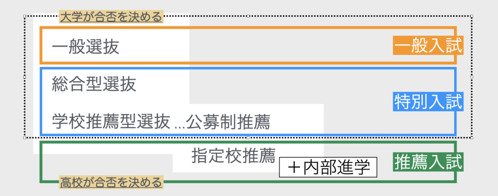 さらに、「学校推薦型選抜」を、合否が実質どこで決まるかで分類します。