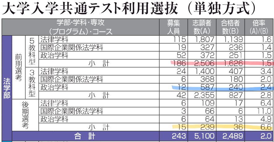 教科数の違い、出願時期の違いがあいまって、倍率がかなり違う(3教科型:2.4倍>5教科型:1.5倍)。